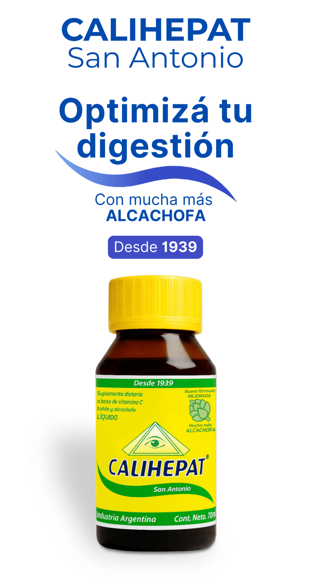 CALIHEPAT Bebida de San Antonio es un suplemento dietario diseñado para quienes buscan optimizar su funcionamiento digestivo. Formulado a base de extractos herbales como la alcachofa, el boldo y la carqueja, cada dosis de 5 ml te ofrece un apoyo nutricional efectivo, complementado con vitamina C.